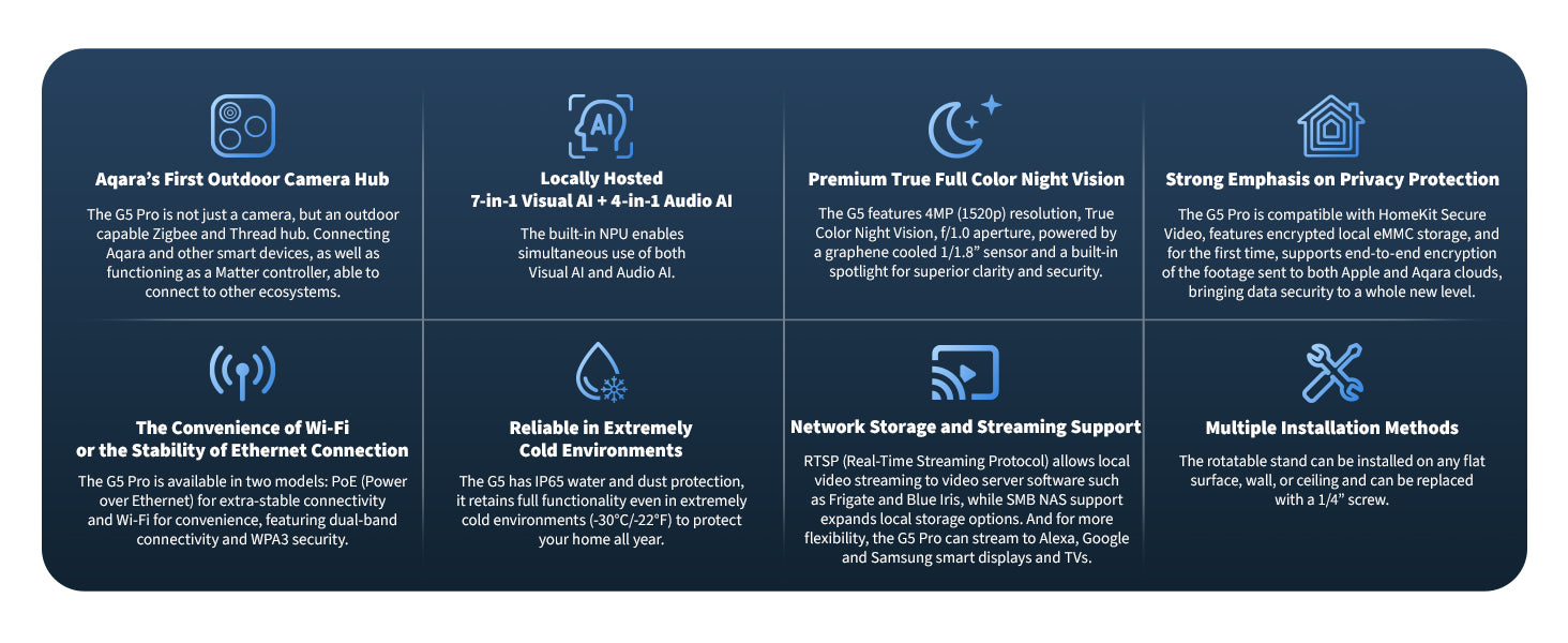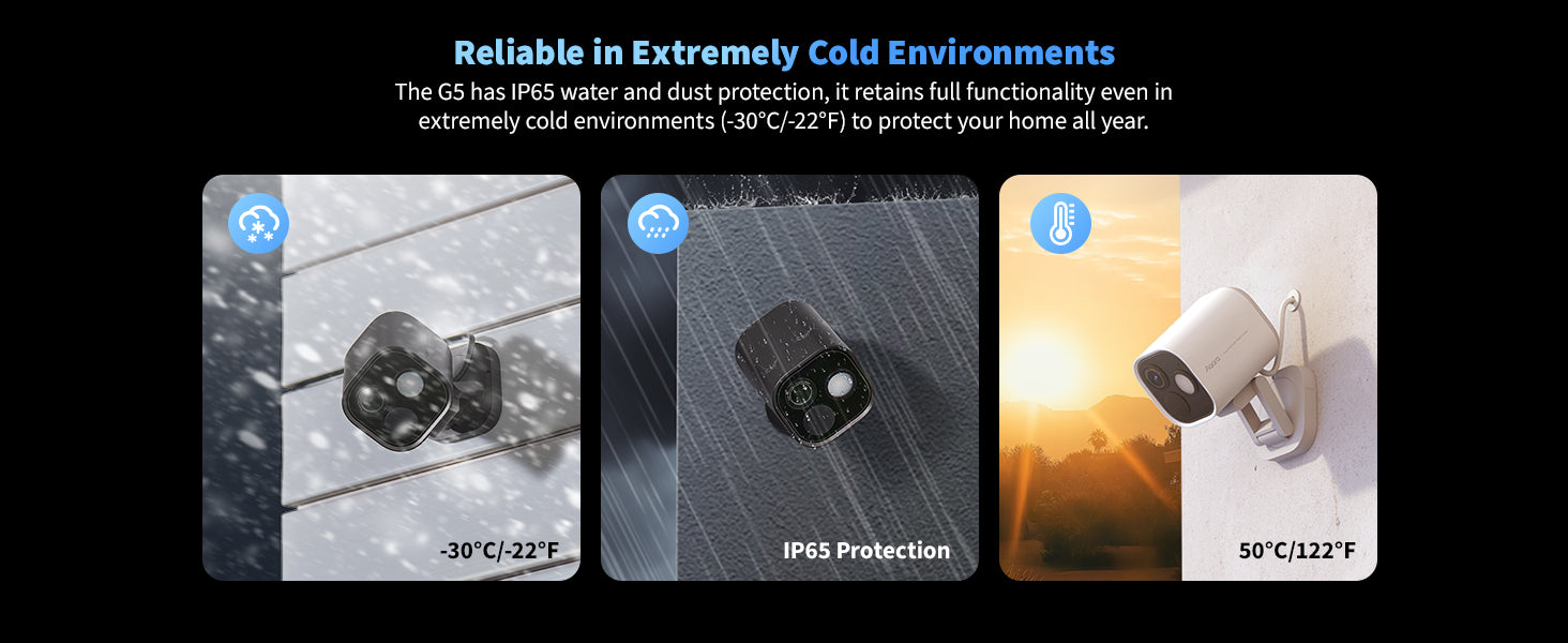 It also boasts a Zigbee and Thread hub, for connecting to Aqara and Third Party Matter devices. It supports 2.4/5GHz Wi-Fi connections. This product is has obtained an IP65 dust and water resistant rating, suitable for use in environments from -30°C to +50°C(-22°F ~ 122°F), making it a versatile monitoring camera.