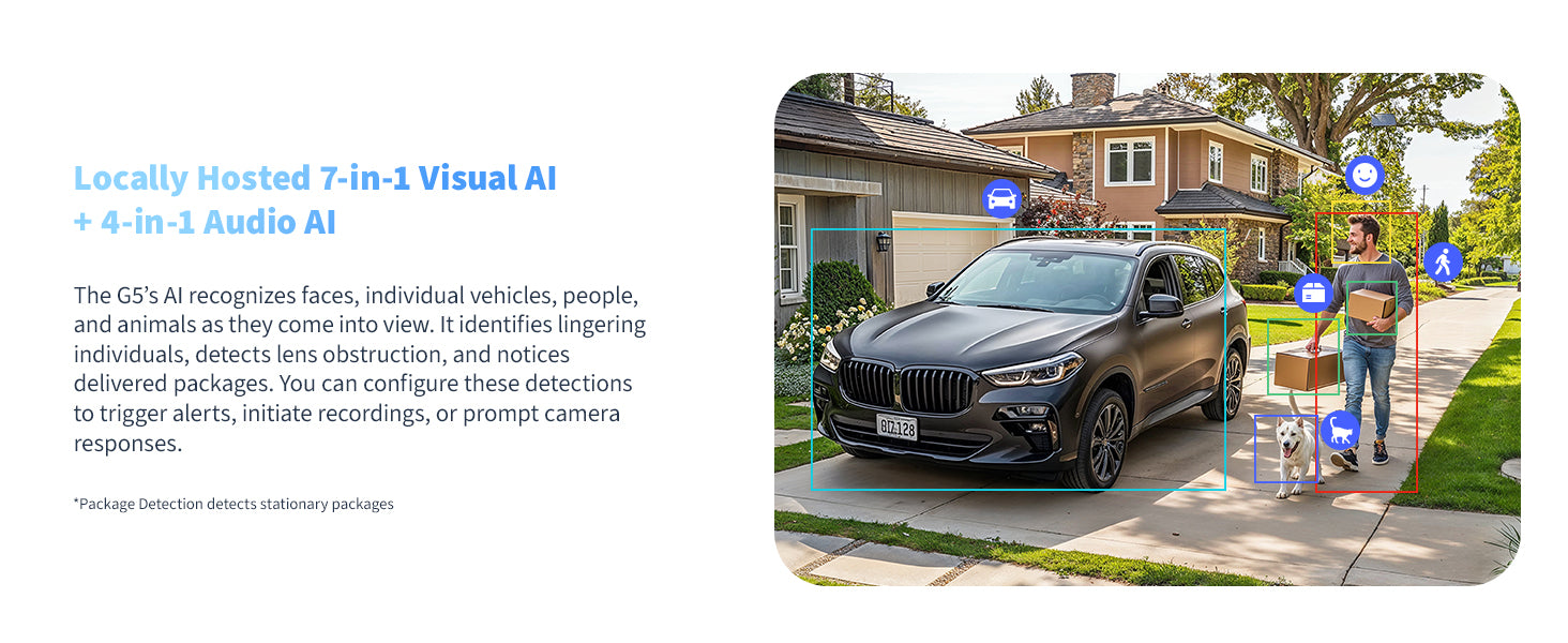The G5 camera also supports PIR motion detection, which can detect whether there are people gathering or lingering within its’ detection range. It features a 3000K color temperature spotlight that provides bright yet comfortable illumination. When activated, it enhances the accuracy of AI identification. The G5 camera enjoys a variety of AI functions such as person detection, pet detection, package detection, lens occlusion detection, face