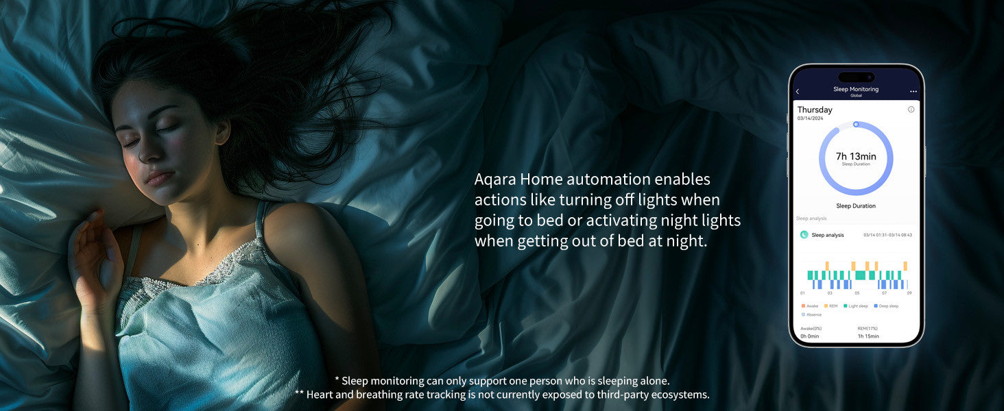 Support independent living with smart elderly care. The FP2 detects unusual inactivity and triggers alerts if no movement is sensed within a set time. Non-wearable sleep monitoring tracks sleep duration, stages, heart rate, and respiration, enabling personalized automations like custom wake-up scenes. It also syncs live positions to the cloud and uses AI to analyze movement patterns, helping assess well-being and provide families with timely care insights.