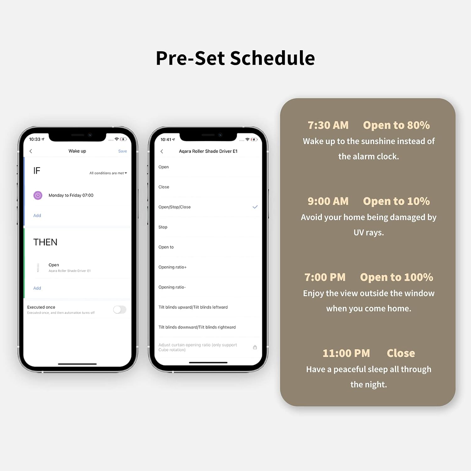 Set a schedule according to your needs, and your shutters open or close automatically in a certain position at a certain time. For example, you can freely set when you wake up, leave the house, come home and sleep.