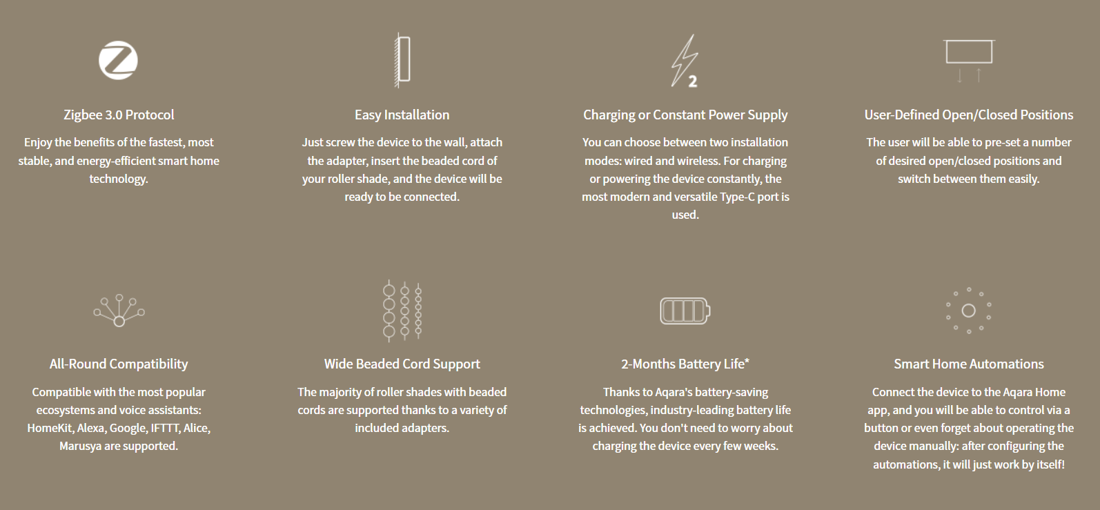 The Aqara E1 roller blind, shutter motor uses Zigbee 3.0, which offers better stability, compatibility and more functions. Apple HomeKit, Alexa, Google Assistant and IFTTT are supported.