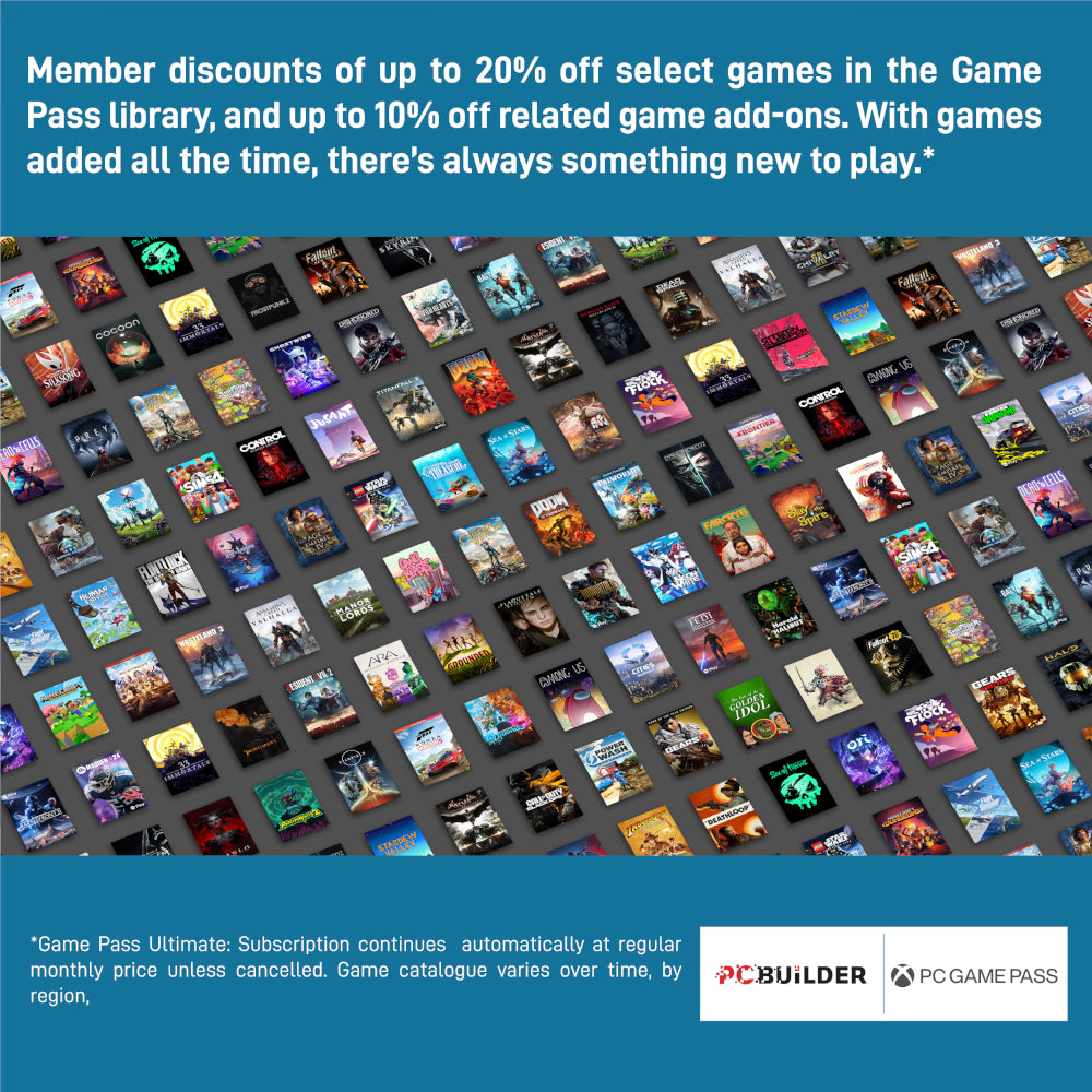 - Play over 100 high-quality PC games, plus new and upcoming blockbusters on day one like Halo Infinite, Forza Horizon 6 and Age of Empires IV with your new build and one month of Game Pass including EA Play. With new games being added all the time, there’s always something new to play.